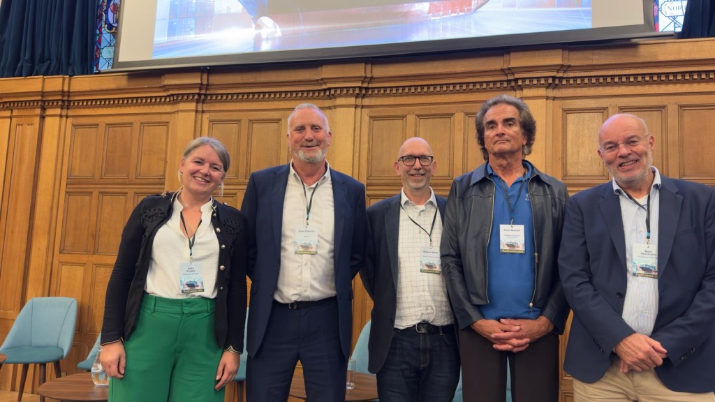 Below the PRIMMA crew that attended PortComms 2025: Mark Beermann, Anke Kuipers and presenter Koen Mioulet; accompanied by the organisers Ross Parsons for BWCS and moderator Grahan Wilde from Three solutions.